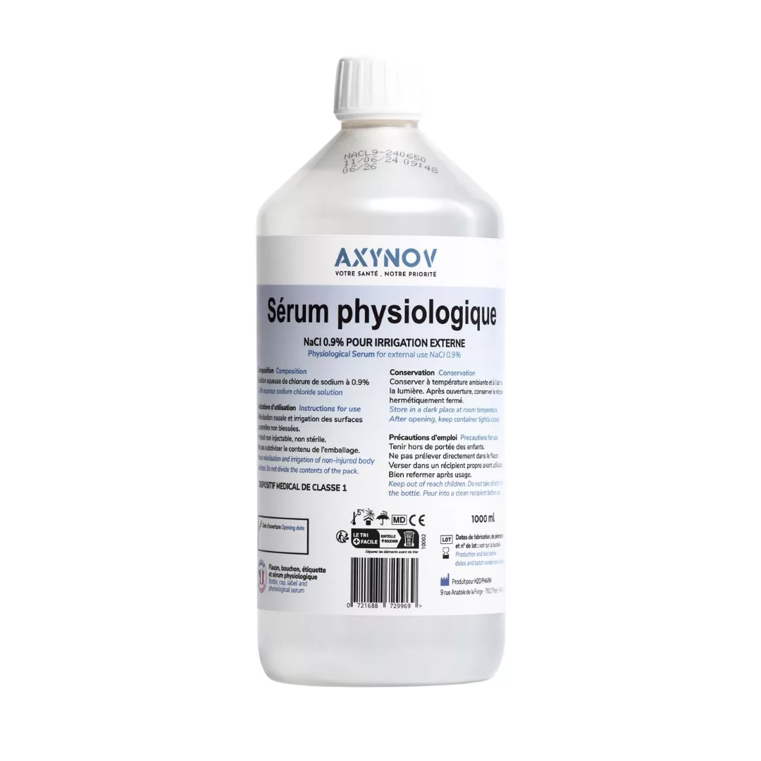 Axynov Sérum Physiologique est une solution saline stérile conçue pour l’hygiène quotidienne des muqueuses : nettoyage oculaire, irrigation des fosses nasales et hygiène générale des voies respiratoires, apportant une action douce, isotonique et respectueuse de l’épithélium pour éliminer impuretés et sécrétions sans irriter.