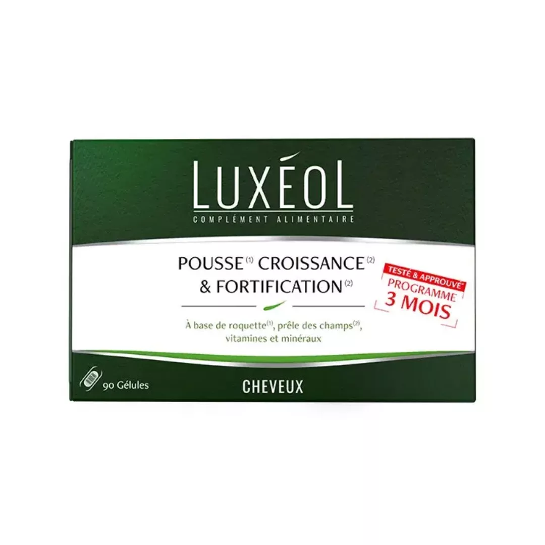 Luxéol Pousse Croissance & Fortification 90 gélules est un complément capillaire formulé pour soutenir la croissance naturelle des cheveux et renforcer la fibre capillaire grâce à un apport ciblé en vitamines, zinc, acides aminés et actifs favorisant la kératine ; il vise à améliorer la densité apparente, la résistance et la brillance des cheveux fins ou fragilisés tout en s’intégrant à une routine de soins capillaires.