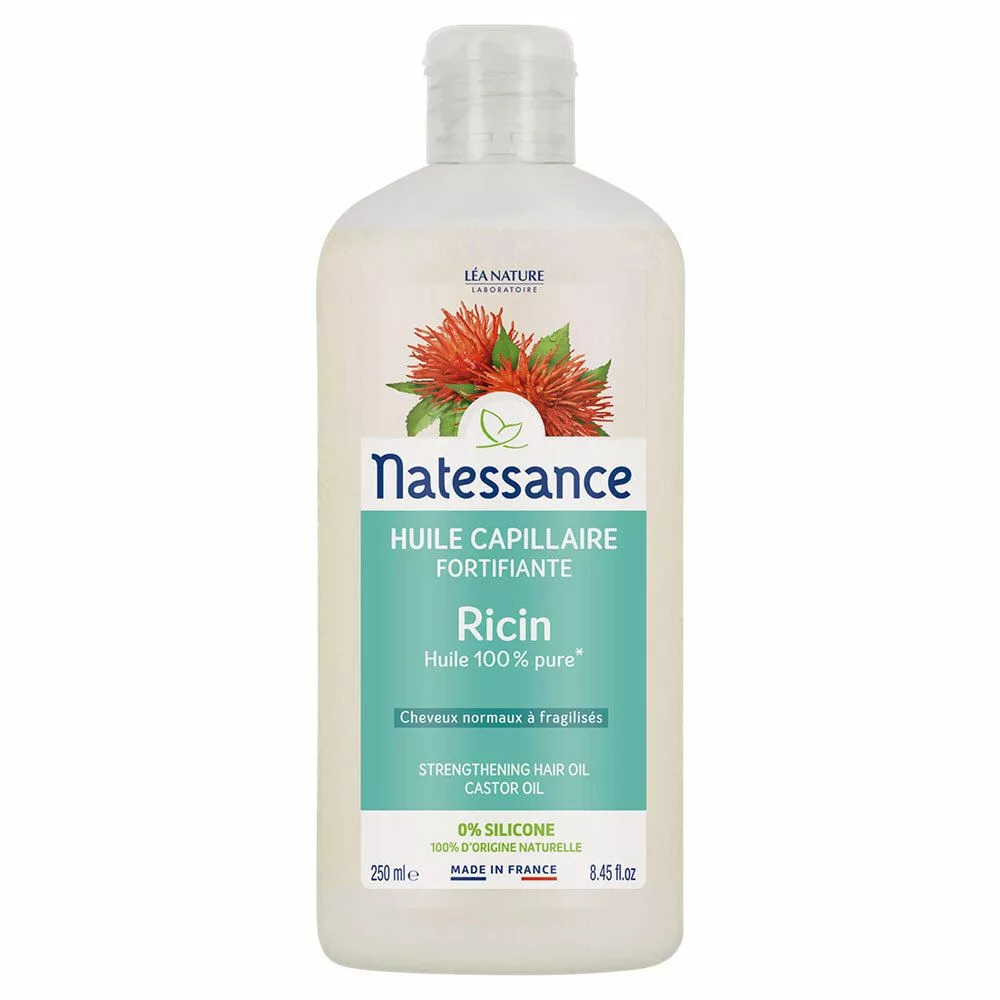 Natessance Huile Capillaire Ricin est une huile capillaire formulée à base d’huile de ricin d’origine végétale, conçue pour nourrir intensément la fibre, apporter brillance et souplesse, protéger les longueurs et faciliter le coiffage tout en respectant le cuir chevelu; ce soin fortifiant et nourrissant s’utilise en bain d’huile, en masque ponctuel ou en application légère pour assouplir les pointes et améliorer l’aspect général des cheveux.